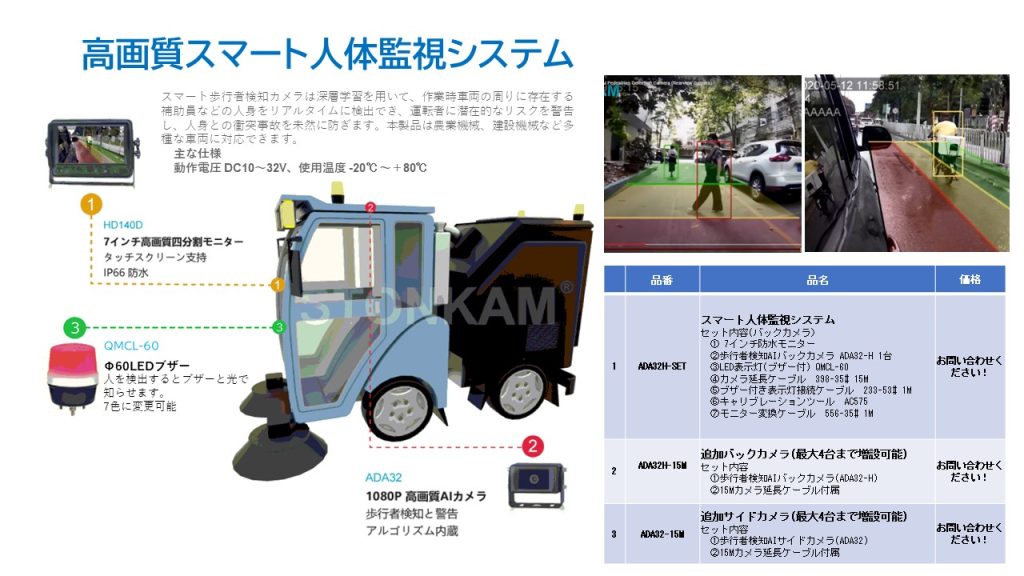 AIカメラ検知器は、周囲の人員、車輌をリアルタイムで検知し、運転者に警告を発信します。これにより、接触事故を防ぎます。